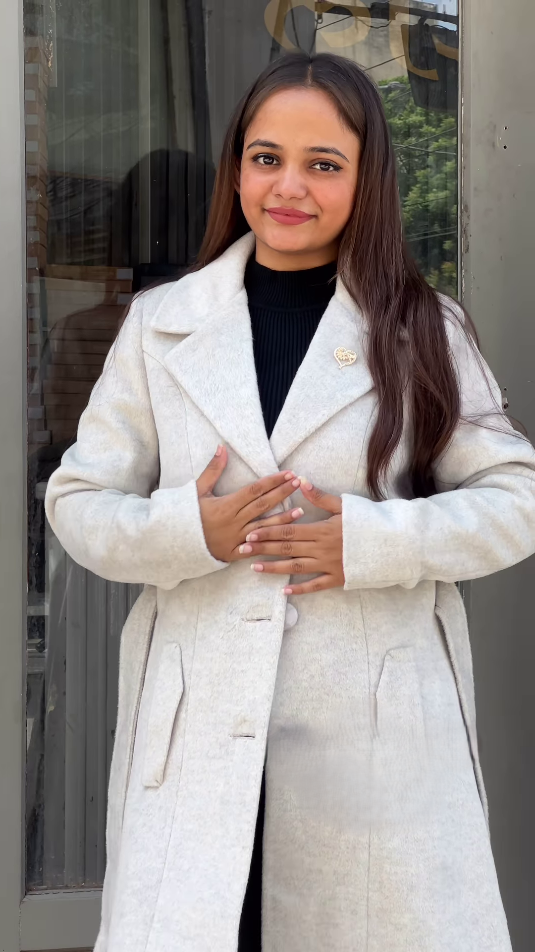 The hero piece is a long, light-colored overcoat with a tailored silhouette and large tonal buttons. Crafted from a soft, structured fabric, the coat offers warmth and shape without bulk. The collared neckline adds architectural definition, while the full-length cut elongates the frame and brings a sense of quiet drama. Whether worn open or cinched closed, the coat delivers a confident, curated look that transitions seamlessly from day to night.