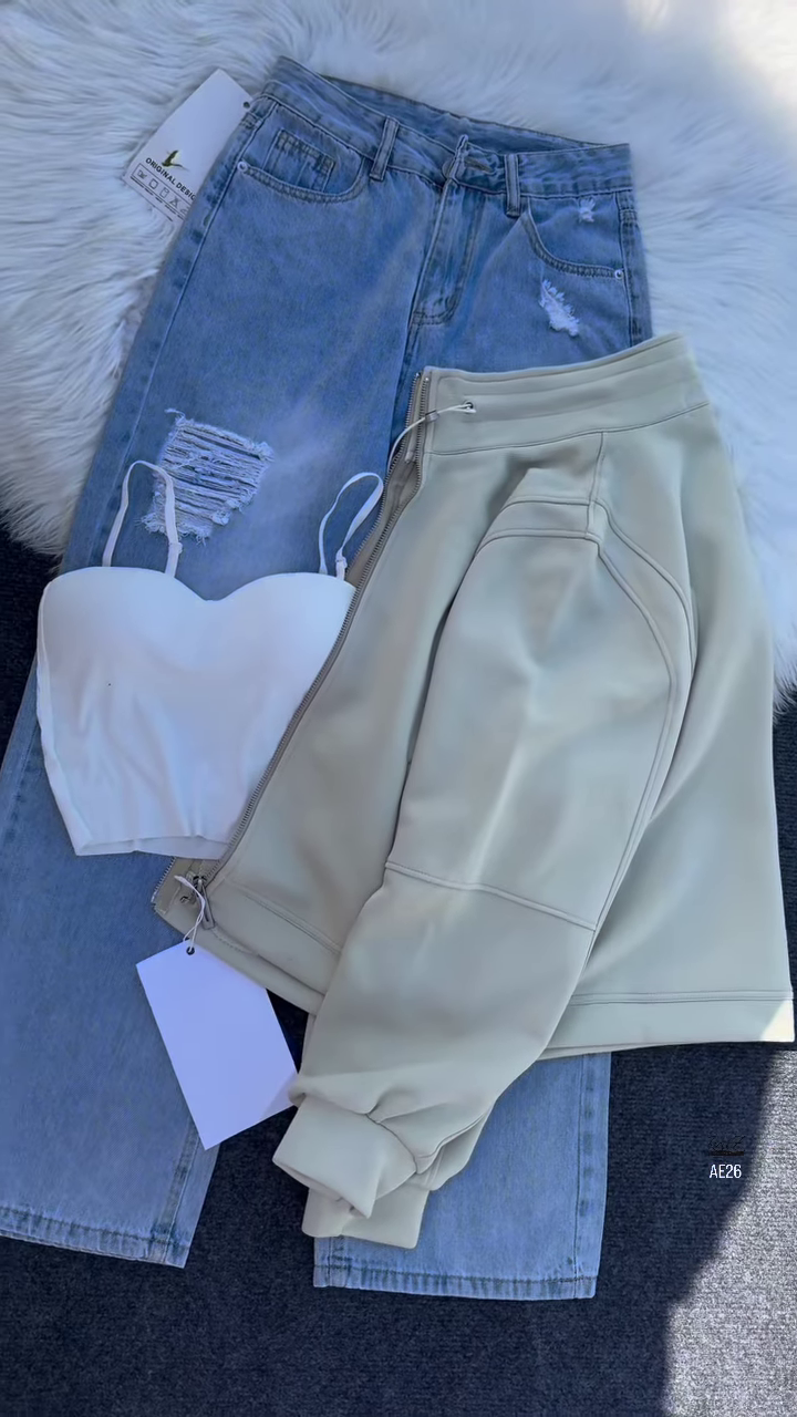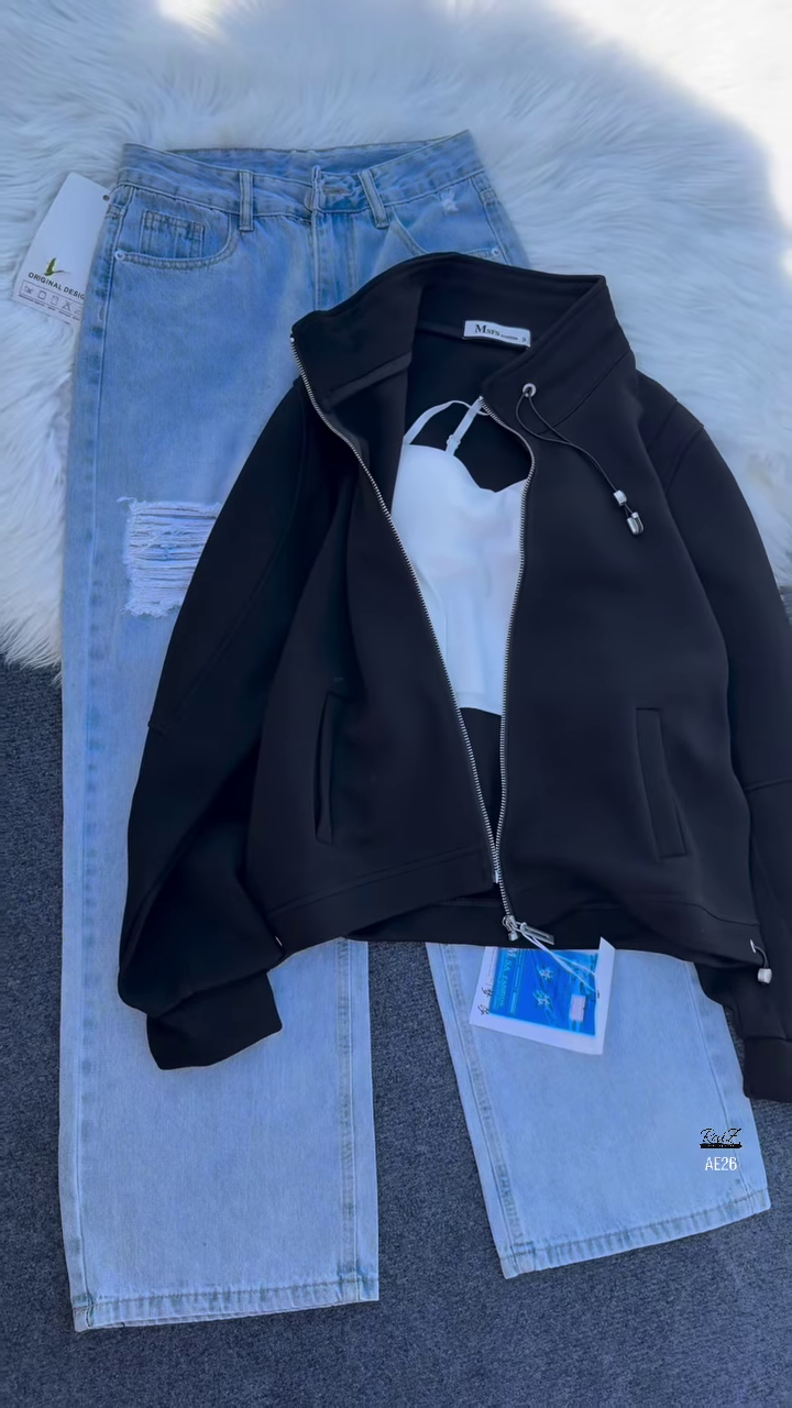 Paired with light blue distressed denim jeans, the set strikes a balance between rugged and refined. The jeans feature a single distressed patch on the left thigh—just enough edge to keep things interesting without overpowering the look. The fit is relaxed yet flattering, ideal for casual wear, boutique styling, or creative shoots. Branding near the hem (“Black X” and “AFS”) adds a streetwear signature, making the piece feel curated and collectible.