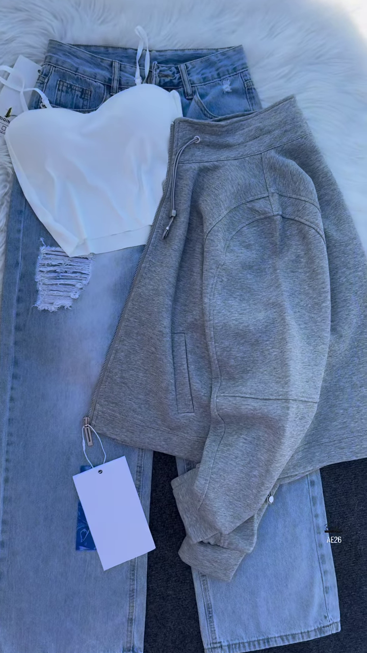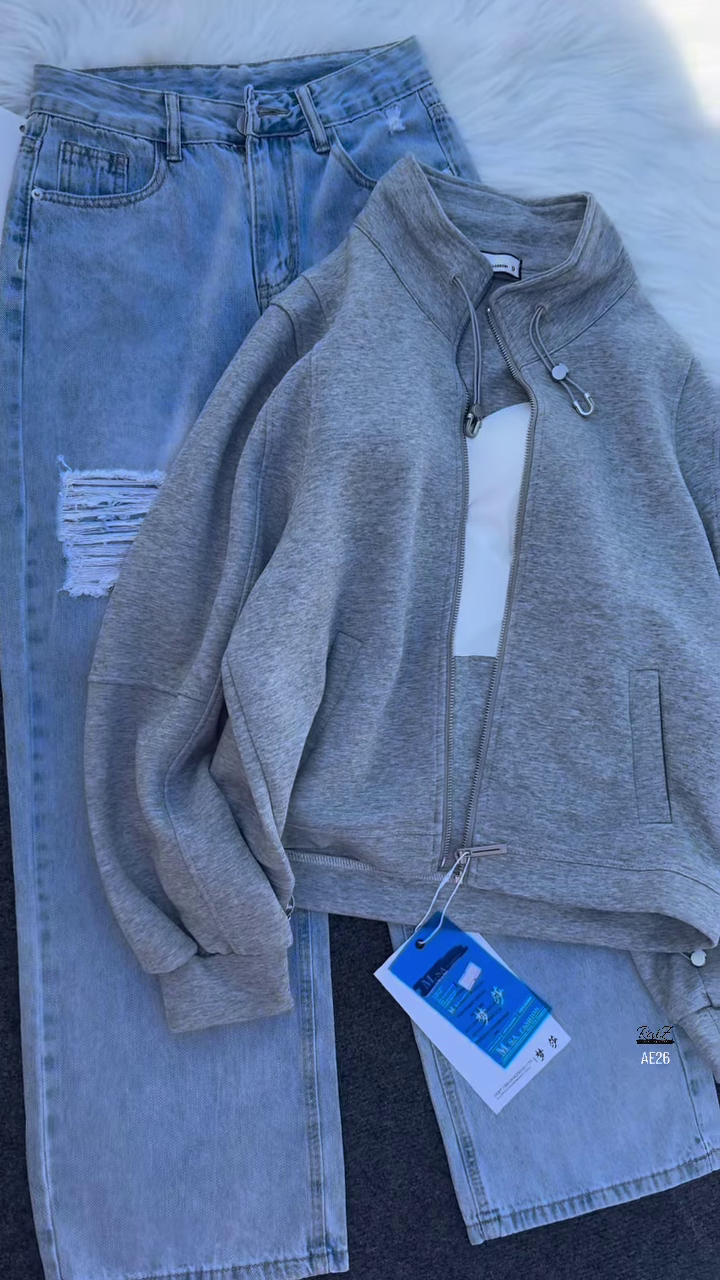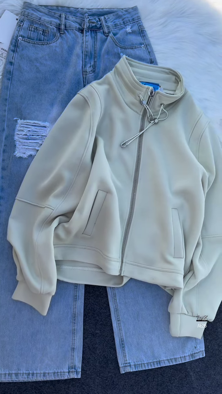 The top half features a maroon zip-up jacket with a high collar and adjustable drawstrings, perfect for layering across seasons. Crafted from a soft, mid-weight fabric, the jacket offers warmth without bulk. The front zipper is smooth and durable, flanked by two side pockets for added utility. Metal eyelets at the cuffs and hem add a subtle industrial touch, while the clean silhouette keeps the look polished. Whether zipped up or worn open, the jacket brings a confident, urban vibe to any outfit.